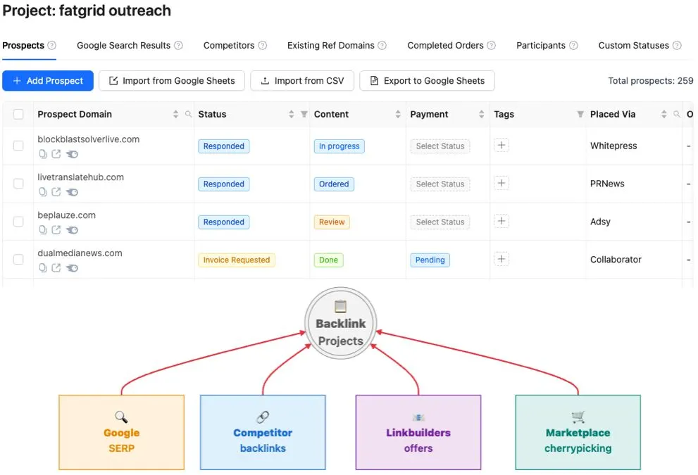 Lists of prospective publishers. Contact details. Outreach status. Orders in progress. Orders that placed through different marketplaces, sellers, and website owners.