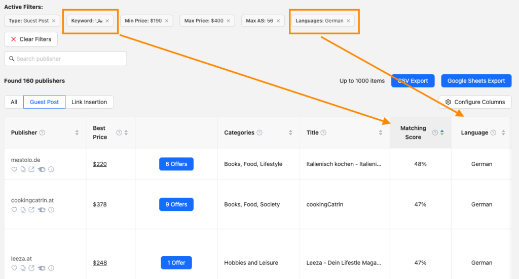Type a keyword in any language, and FatGrid will show you relevant websites in all languages. Building links for a “website hosting” client? You’ll now find international matches in seconds.